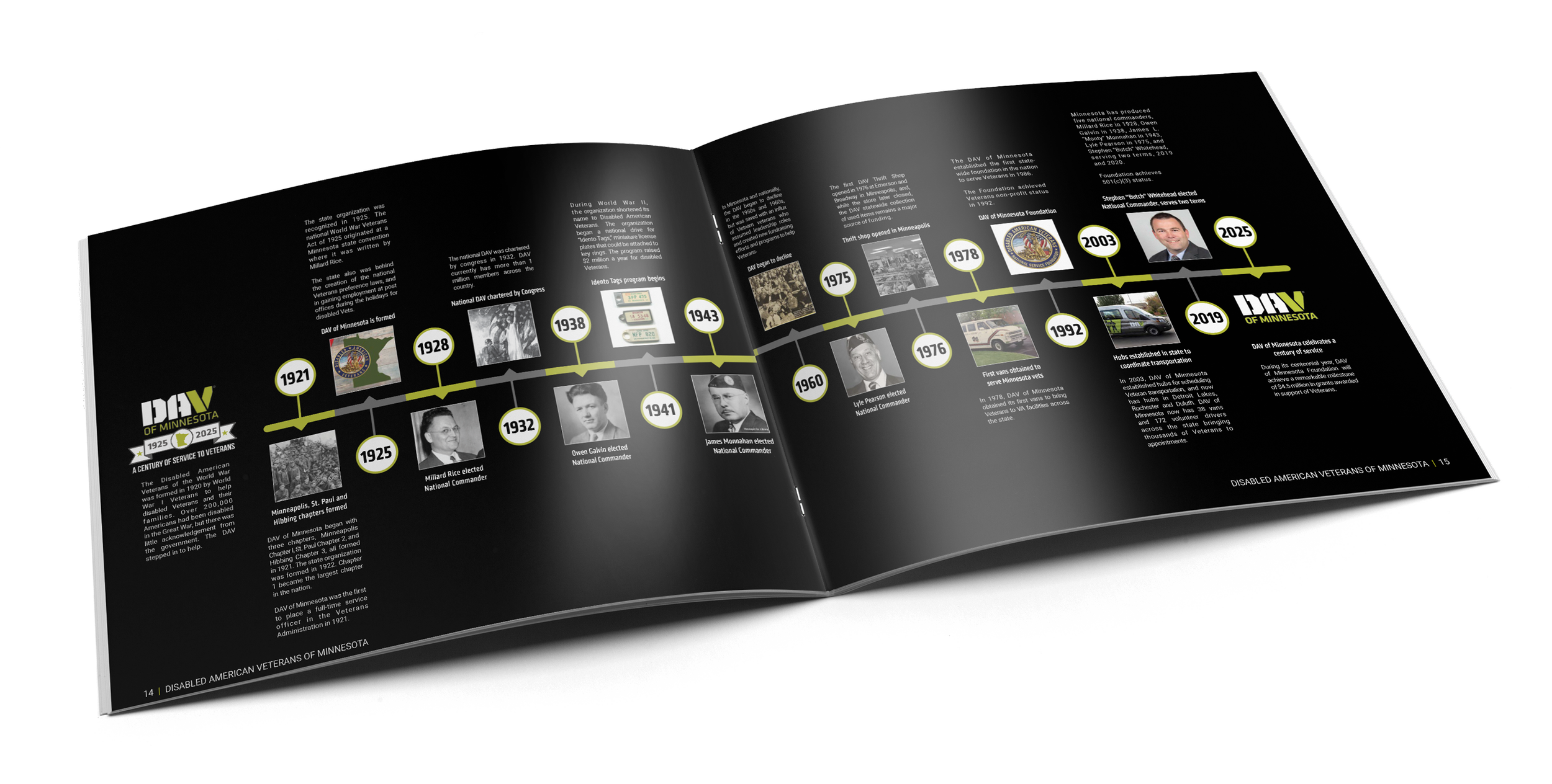 The project had a tight six-week timeline and a firm delivery deadline for the DAV Commander and Foundation Executive Director. Working under the direction of SnowGlobe Public Relations, key visual elements included a custom-designed 100-year timeline. The rotated layout required a print partner experienced with this specialized format.