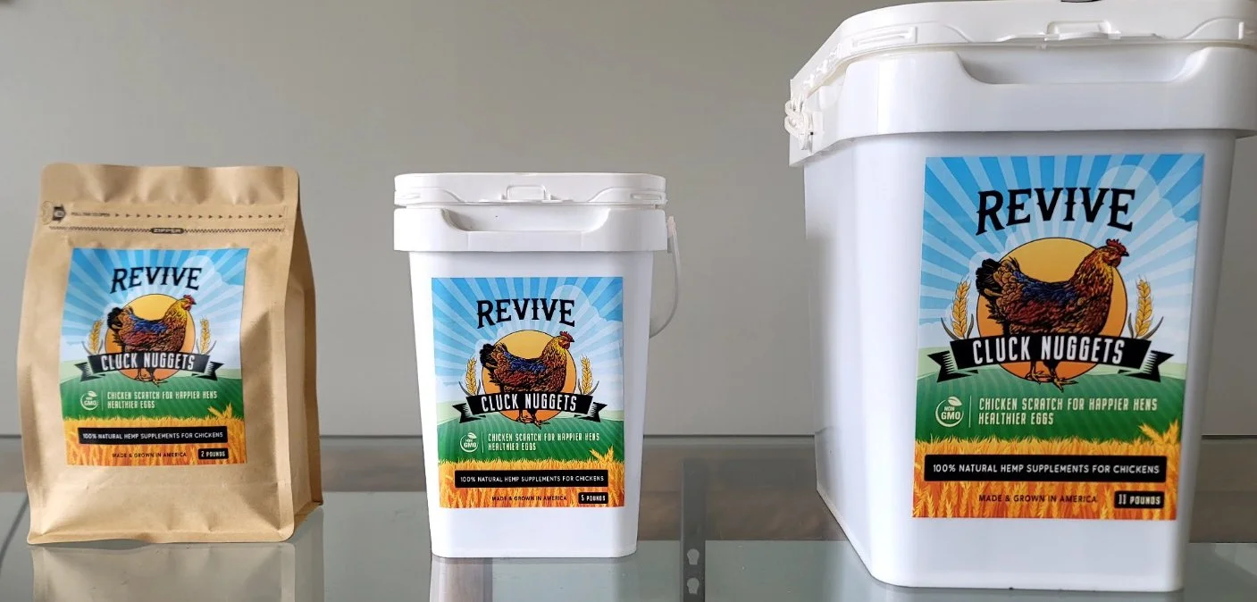 Create the brand identity and product packaging for Revive, a new line of hemp-based supplements for chickens. The goal was to craft a cheerful, eye-catching aesthetic that stands out both on shelves and online, setting the tone for future product lines.