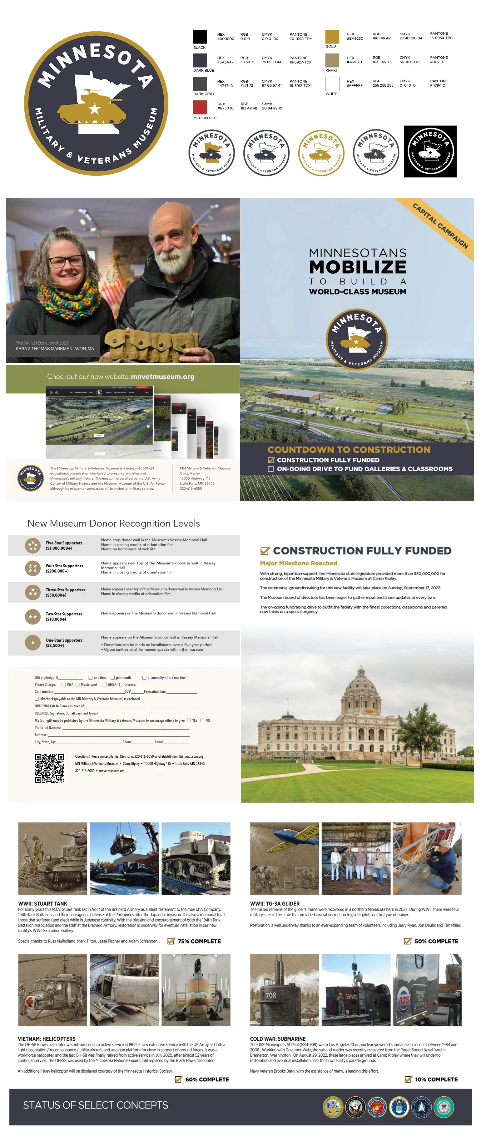 Develop the entire visual identity and campaign materials with the Executive Director Randal Dietrich of the Minnesota Military & Veterans Museum. This includes materials for a 45+ million dollar capital campaign, supporting the construction of a new museum set to open in the summer of 2026.